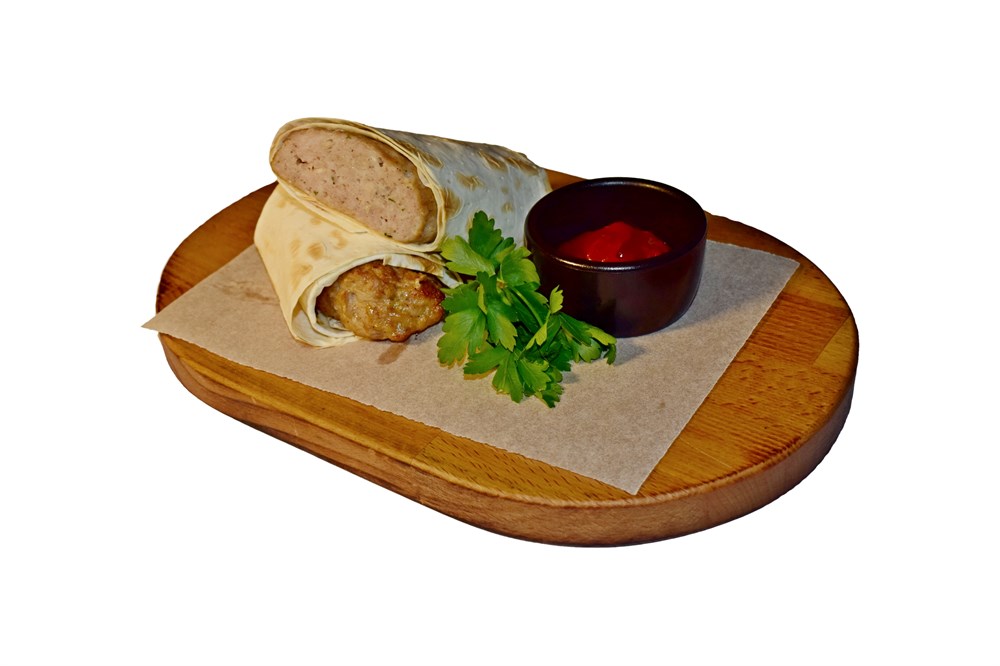 Нежный люля-кебаб из отборного куриного фарша с ароматными специями, чесноком и сочным репчатым лучком. Подается в мягком лаваше с соусом сацебели и зеленью