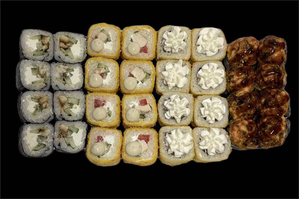 Филадельфия Роял, запеченный ролл с мидиями, сливочный с угрем, цыпленок тортилья (32 шт)
